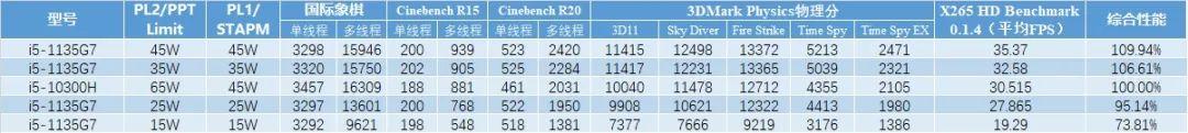 在之前的测试中,我们尝试将i5-1135G7解锁到35W和45W并完成了测试: