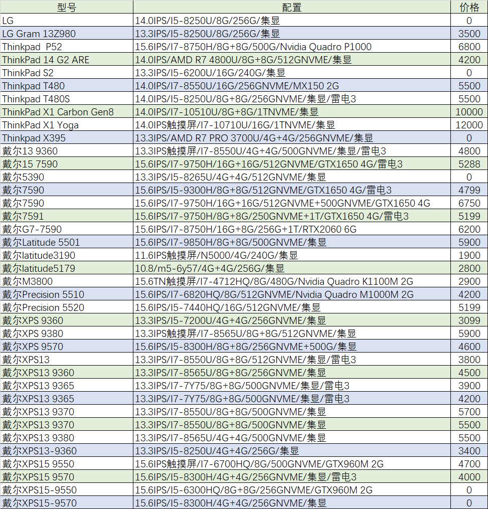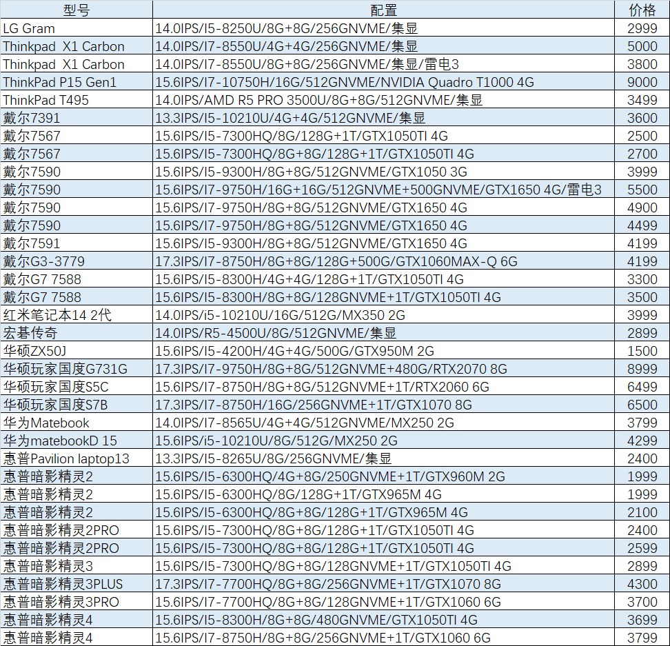 上周已售出机型:(无法列出成色,价格仅供参考)
