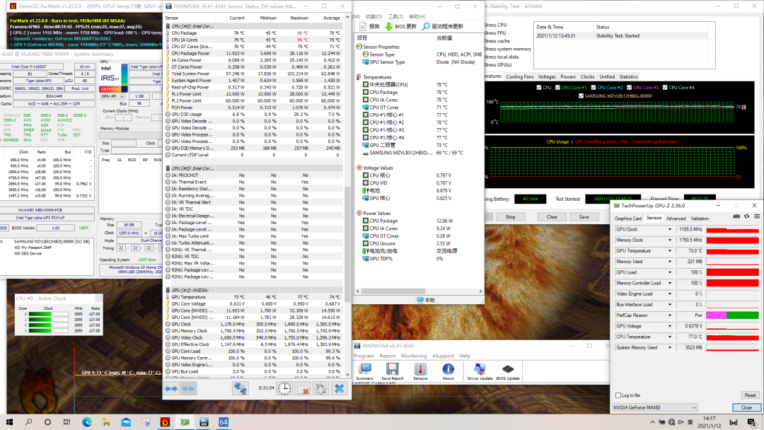 使用Fn+P切换至“高能模式”,然后使用Stress CPU+Furmark进行压力测试。