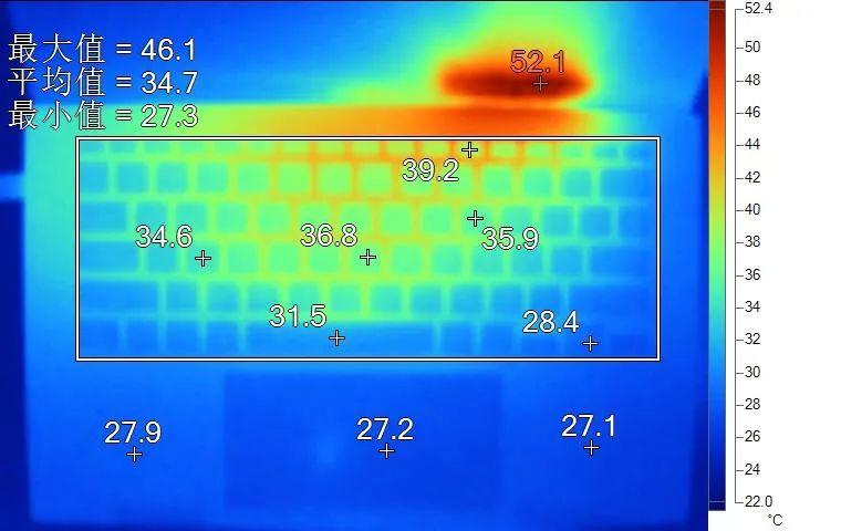 表面温度如上图所示,键盘键帽温度最高为39.2℃,WASD键位区域在34.6℃附近,方向键28.4℃。背面温度最高48℃,中心点32.8℃。