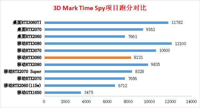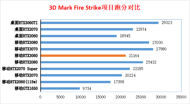 Fire Strike测试的是DX11的性能,其中Fire Strike对应1080p分辨率。在该项测试里,移动RTX3060比移动RTX2070略好,比移动RTX2070SUPER略差。