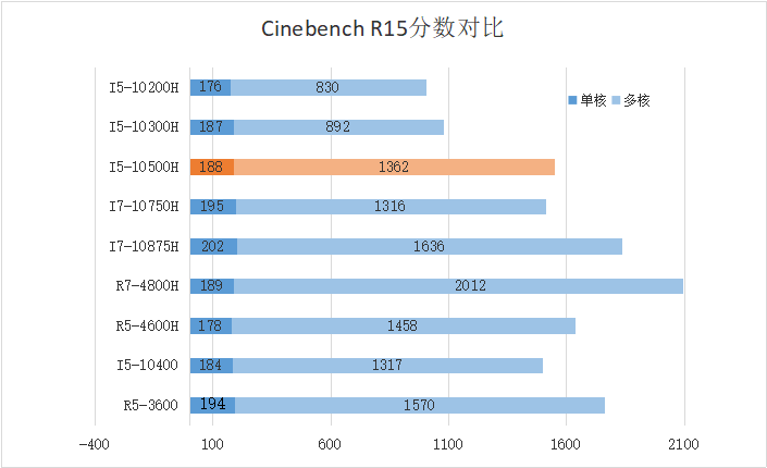 通过Cinebench R15进行测试,酷睿i5-10500H的单核分数为188cb,多核分数为1362cb,我们将酷睿i7-10750H、桌面I5-10400、锐龙R7-4800H、锐龙R5-4600H、桌面锐龙R5-3600、酷睿I5-10300H、酷睿I5-10200H加入对比,以比较桌面级处理器和移动标压/低压处理器以及锐龙移动端处理器之间的性能差距。