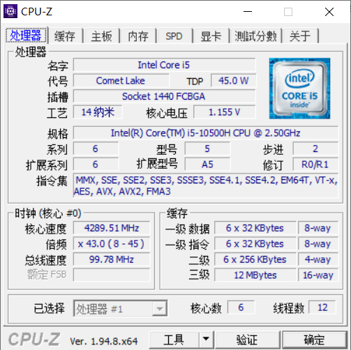 酷睿I5-10500H处理器,6核心12线程,基于Comet Lake架构、14nm工艺,基础频率2.5GHz,单核最大睿频4.5GHz,12MB三级缓存,集成UHD核显,TDP 45W。最大内存频率支持到2933MHz。和i7-10750H(默频2.6GHz、睿频5.0GHz)一样的6核12线程强大规格,i5-10500H和i7-10750H之间的差异仅为单核心最大睿频低500MHz,在实际跑分项目中,单核心分数会弱15%,但在多核心性能基本上完全一样。背刺之前I7-10750H用户