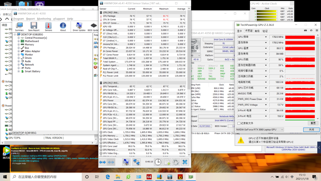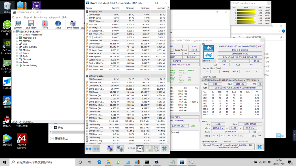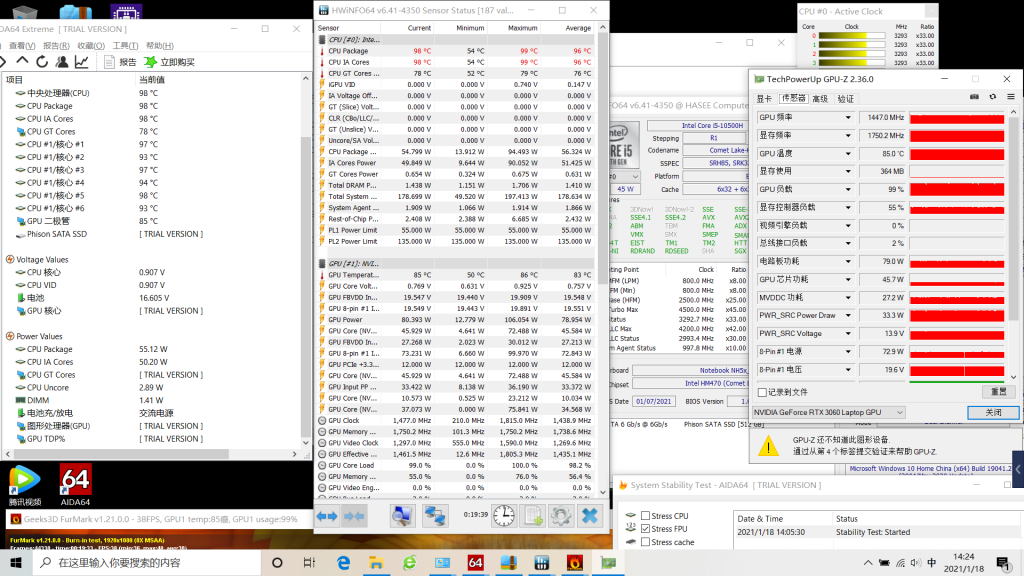用AIDA64满载测试,单烤FPU情况下,最高温可以达到98°C,平均下来是77°C;瞬时功耗没有触碰到PL2的135W,在稳定一段时间后维持在了PL1的55W上,频率维持在了3.3GHZ。在之前的Z8 CU7版本中I7-10750H的PL1也才45W,相对来说提升了10W,温度也适当的升高了10°C。