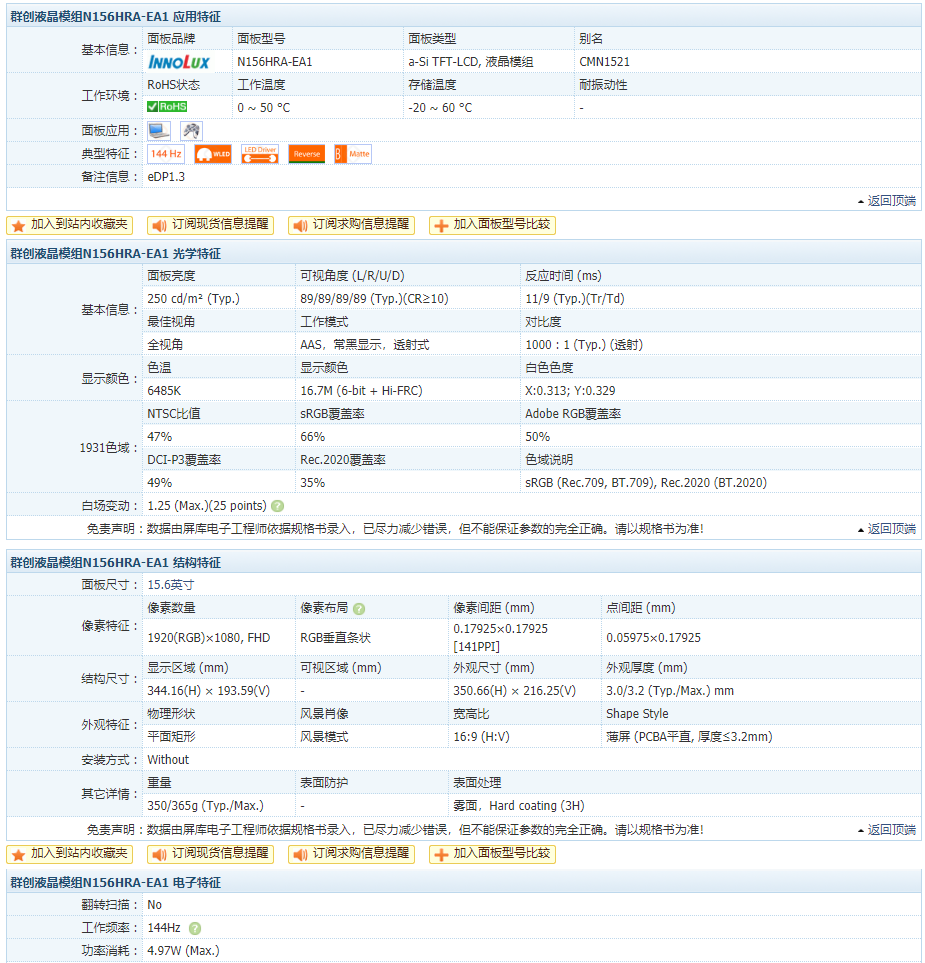 Z8使用的45% NTSC低色域144Hz电竞屏,由于此次没有带上红蜘蛛X设备,因此直接上屏库网的参数图: