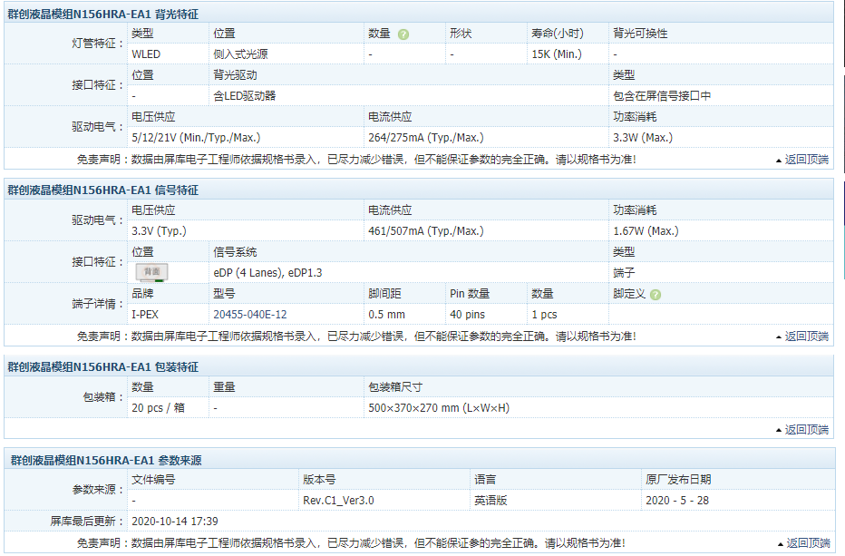 从屏库网资料可知该屏幕雾面屏,面板亮度250cd/m²,标称对比度1000:1,色域47%NTSC,响应时间20ms,色深为6bit。