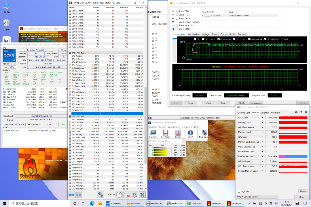 针对独显轻薄本,我们使用负载较低的Stress CPU+Furmark进行压力测试。