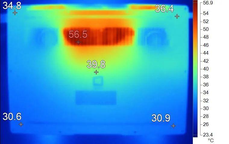 表面温度如上图所示,键盘键帽最高温度出现在键盘中部,WASD键在37℃附近,方向键31.4℃。背面中心点39.8℃。
