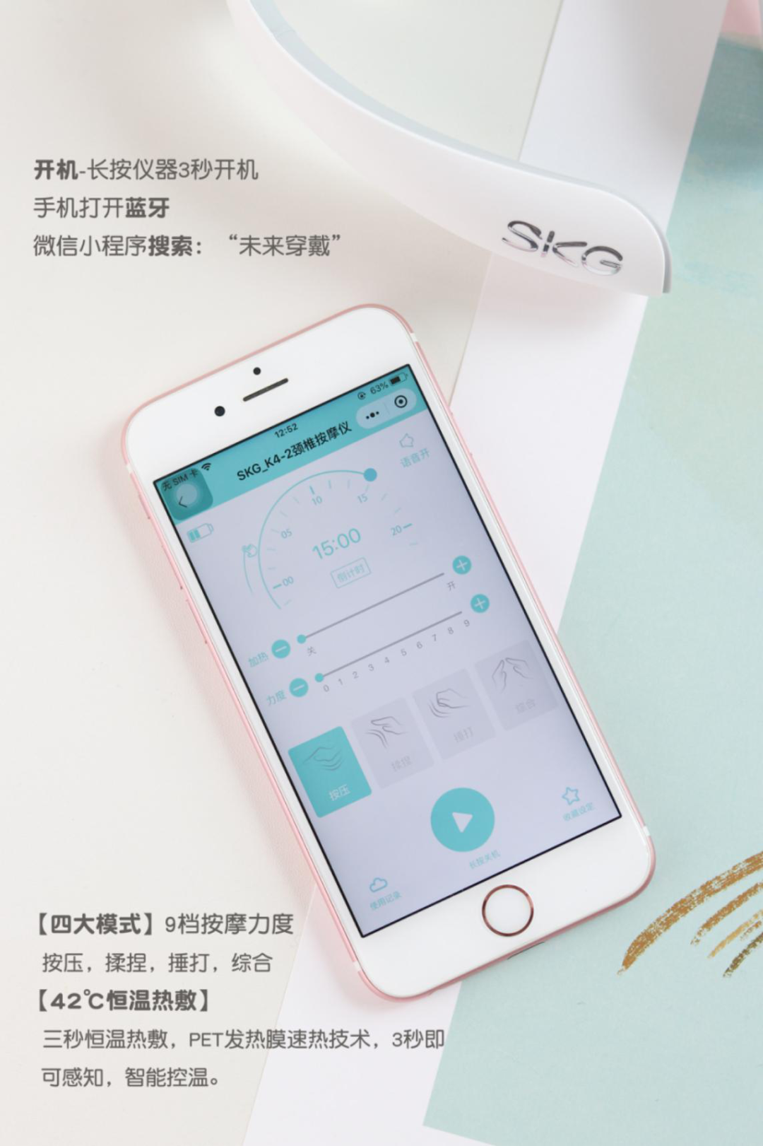 这款全新 K4-2 使用起来更加方便,除了可以机身按键操控以外,还可以在手机应用中心下载【未来穿戴】APP或微信搜索【未来穿戴】小程序。一键蓝牙连接,还有记忆功能,用智能小程序一键收藏按摩喜好,就很高科技。