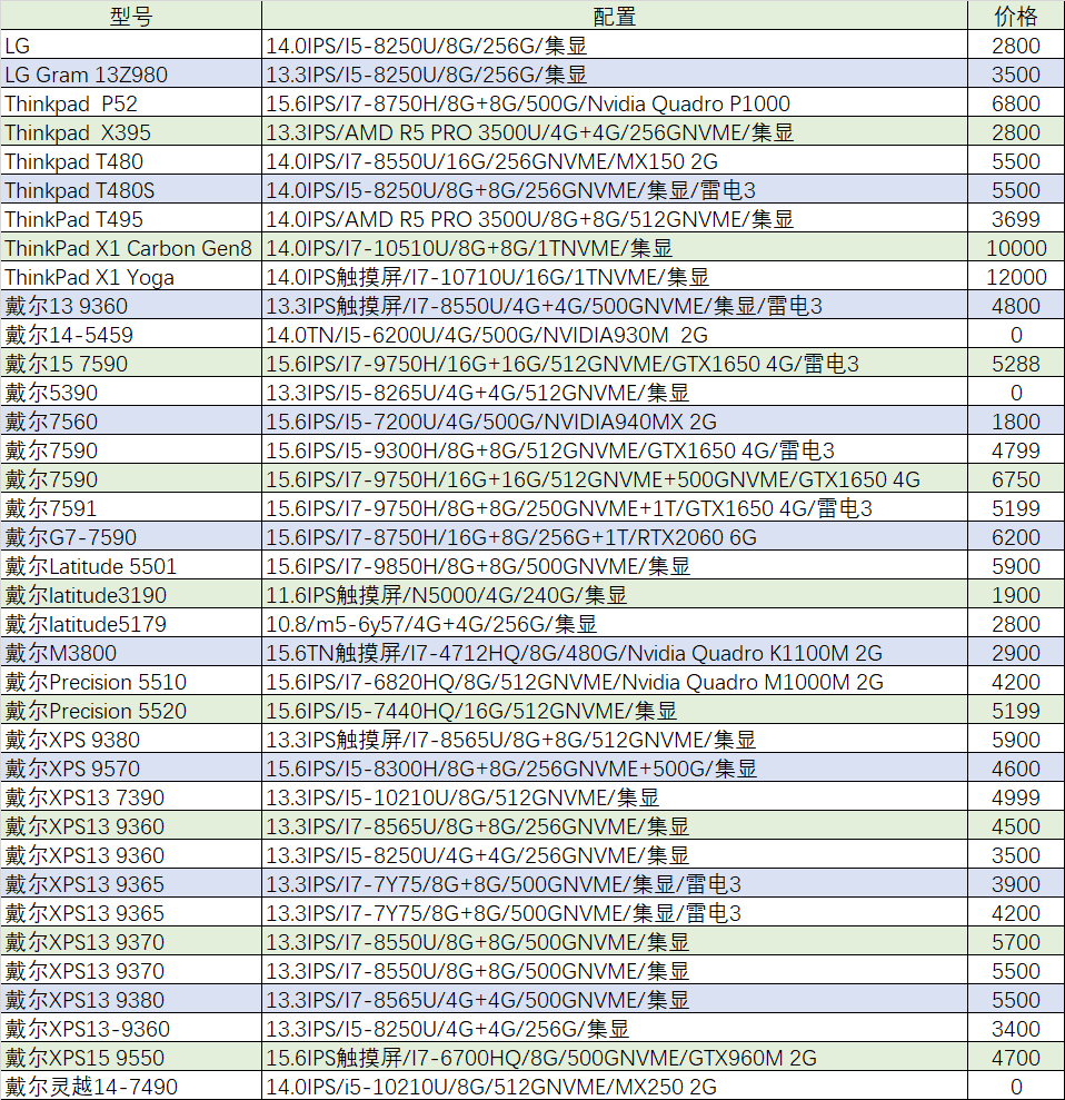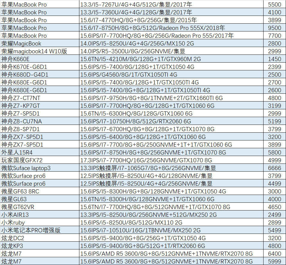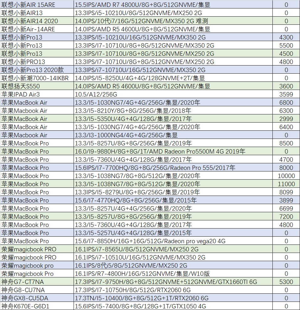 上周已售出机型:(无法列出成色,价格仅供参考)