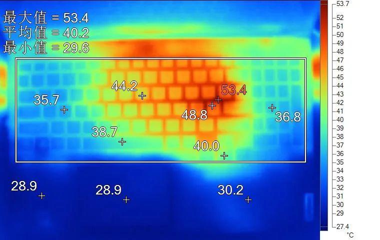 表面温度如上图所示,键盘键帽温度最高为48.8℃,WASD键位区域在36℃附近,方向键约40℃,左腕托温度为28.9℃。
