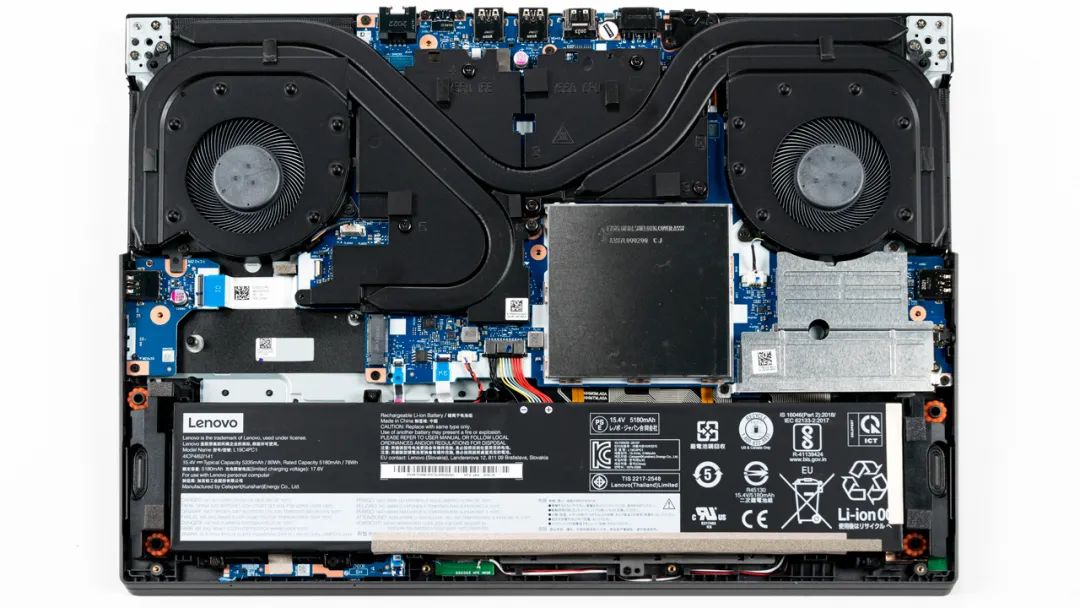上图是联想 拯救者 Y7000P 2020的拆机实拍图,三热管双风扇的组合,与Y7000基本一致,不同的地方是取消了2.5寸SATA硬盘位,同时电池增大到了78Wh。