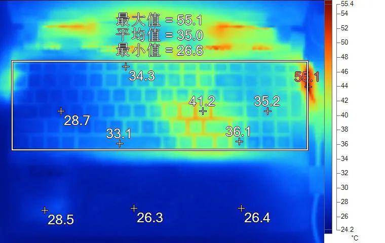 表面温度如上图所示,键盘键帽温度最高为41.2℃,WASD键位区域在29℃附近,方向键36.1℃。左腕托温度为28.5℃。