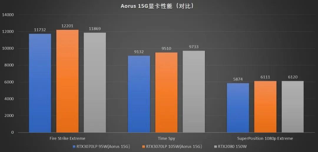 为了挖掘AORUS 15G的GPU性能,选取3个项目进行对比,可以看到105W的RTX3070 LP基本和150W的RTX2080打得有来有回,20系的“砖头机”再次被30系的更加轻薄的机器取代了,近几代显卡性能和能耗比的进步还是很明显的。
