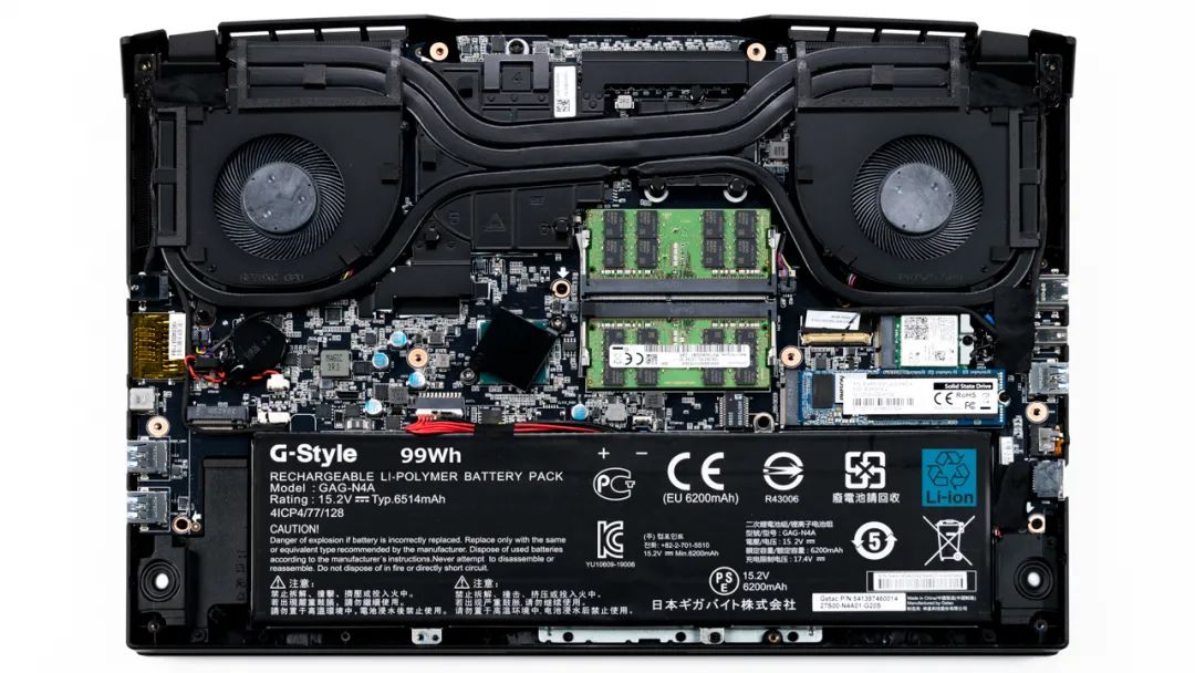 上图是AORUS 15G的拆机实拍图,五热管双风扇的组合,其中一根热管给显卡供电散热,藏在散热片下面,散热模组和上一代产品基本一致。