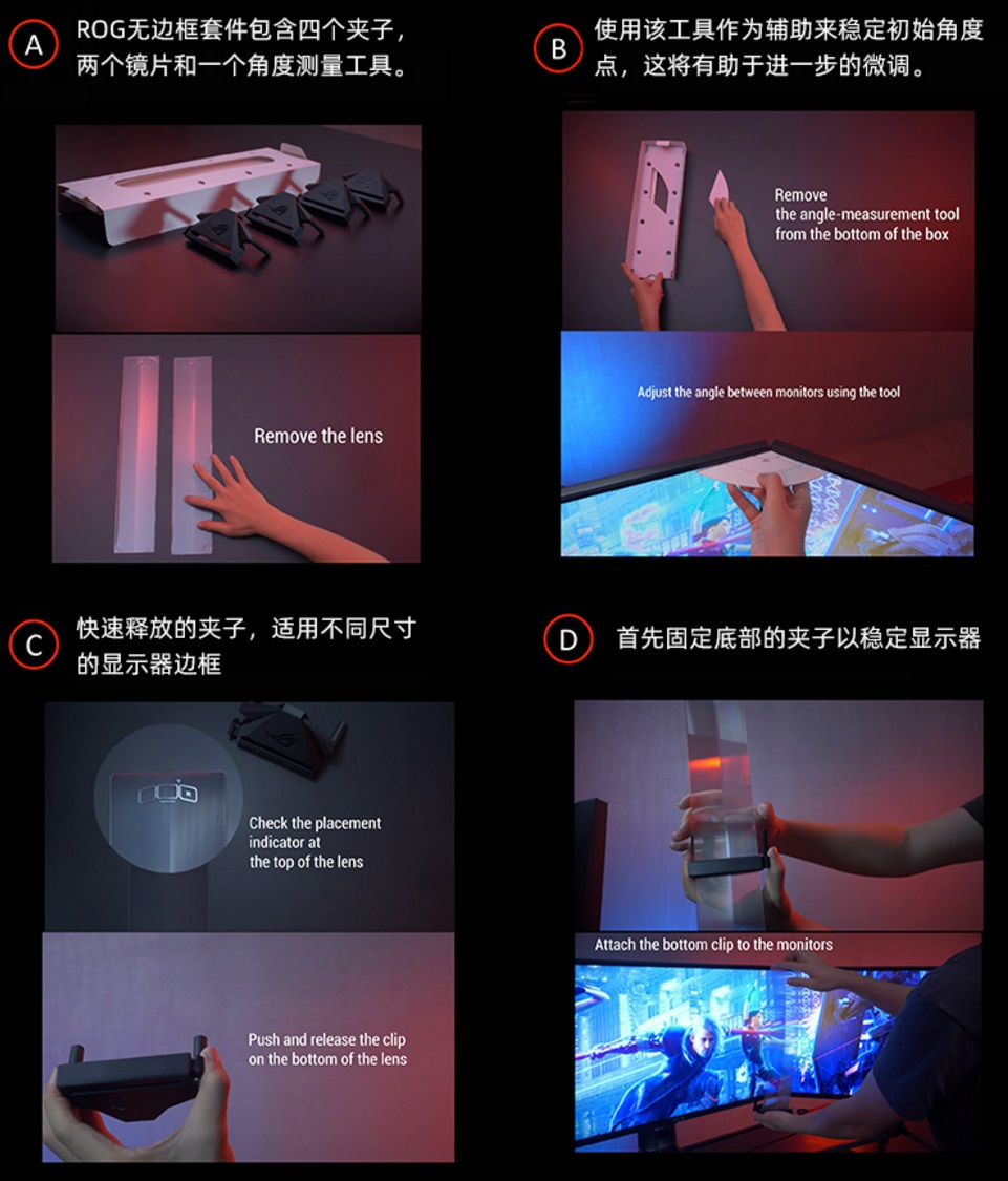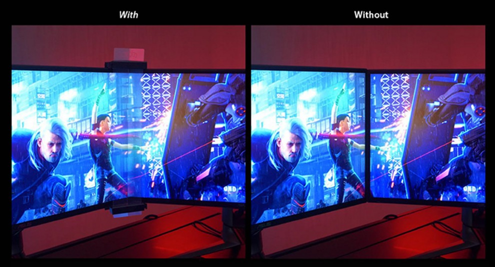 这款产品可用在27寸以下的窄边框显示器,包含折射光线的结构,从视觉上消除显示器之间的缝隙