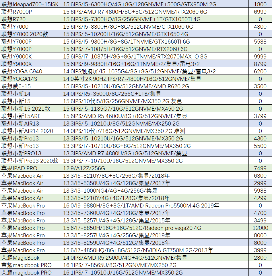 本周待售机型:(无法列出成色,价格仅供参考,0元表示卖家未定价)