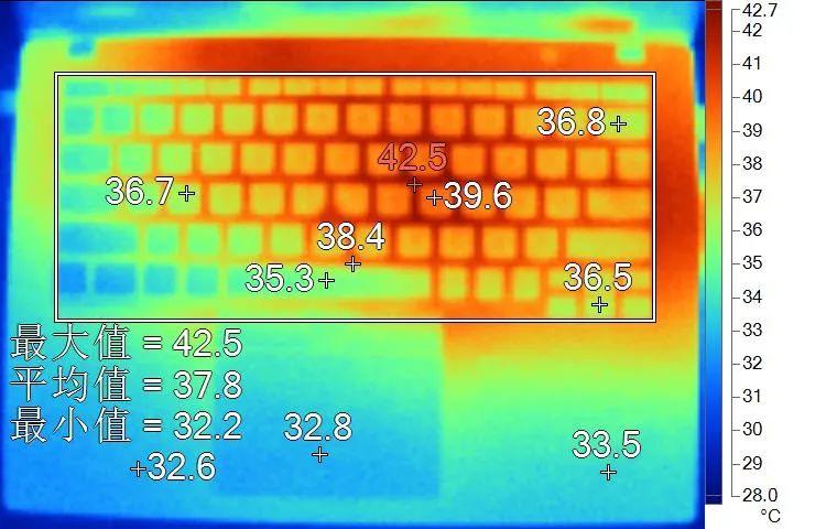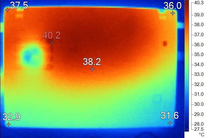 表面温度如上图所示,键盘键帽温度最高为39.6℃,WASD键位区域在36.7℃附近,方向键36.5℃。背面温度最高40.2℃,中心点38.2℃。