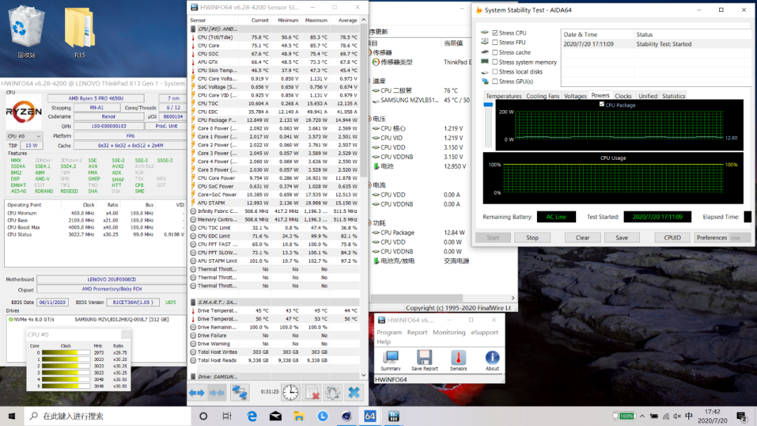 在满载状态下,CPU温度最高85℃,稳定在76℃,功耗约13W,频率维持在3.0GHz。