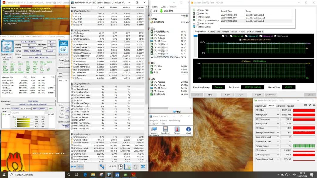 针对轻薄本,我们使用负载较低的Stress CPU+Furmark进行压力测试。