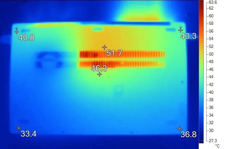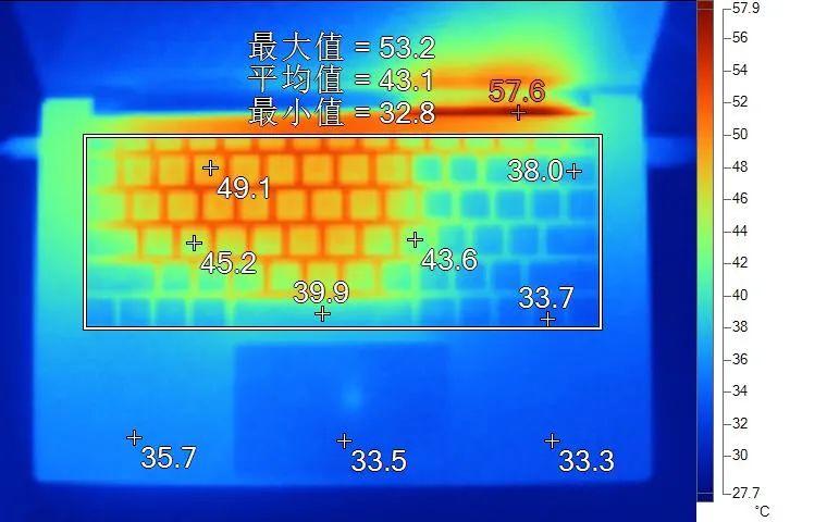 表面温度如上图所示,键盘键帽最高为49.1℃,WASD键位区域在45℃附近,方向键33.7℃。背面最高约51.7℃,中心点46.3℃。
