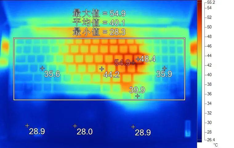 表面温度如上图所示,键盘键帽温度最高为48.4℃,WASD键位区域在35℃附近,方向键39.9℃。左腕托温度为28.9℃。