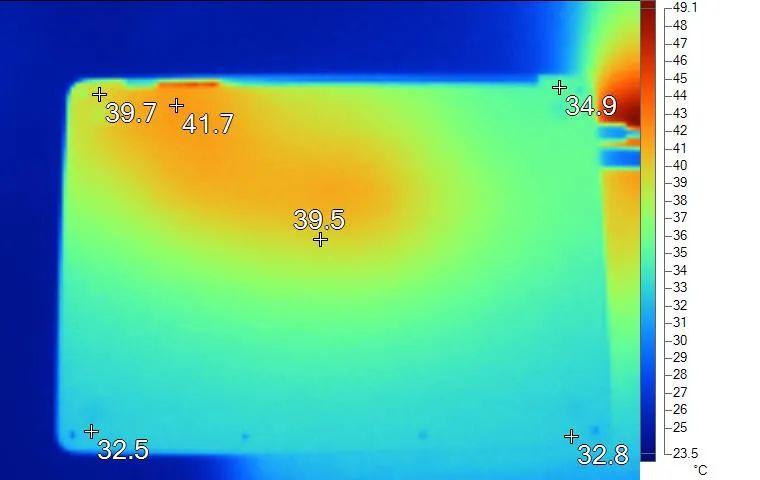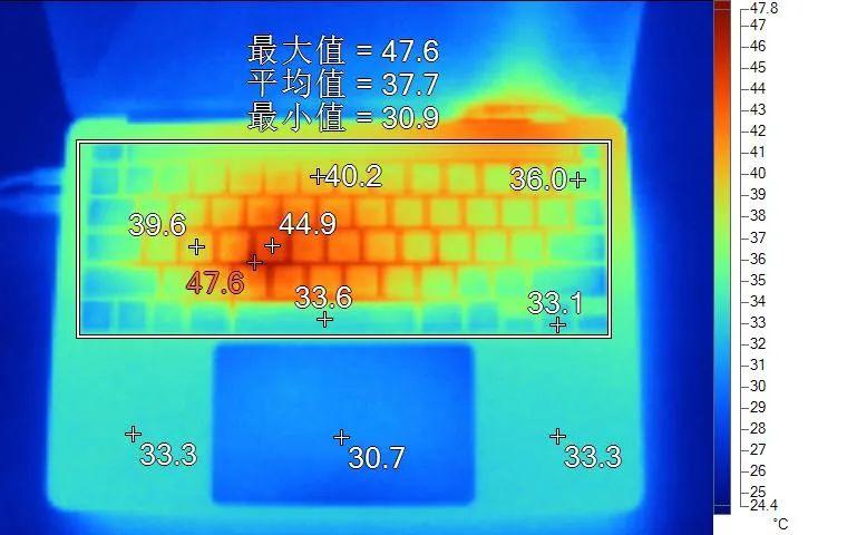 表面温度如上图所示,键盘键帽温度最高为44.9℃,WASD键位区域在40℃附近,方向键33.1℃。左腕托温度为33.3℃。背面温度如上图所示,最高温度约41.7℃。