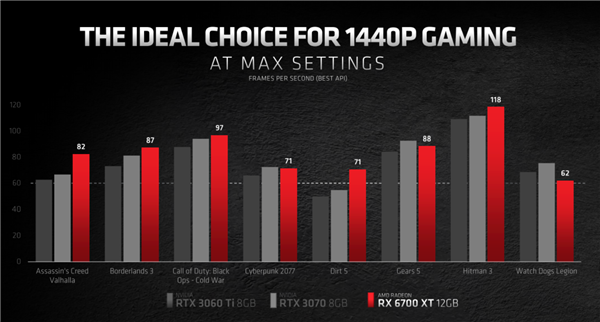 从图表中可以看到,在2K分辨率、最高画质下,除了看门狗:军团、战争机器5和赛博朋克2077以外,RX 6700 XT的成绩均占优,同时后两款游戏帧数也仅仅是小幅落后于RTX 3070 8GB。
