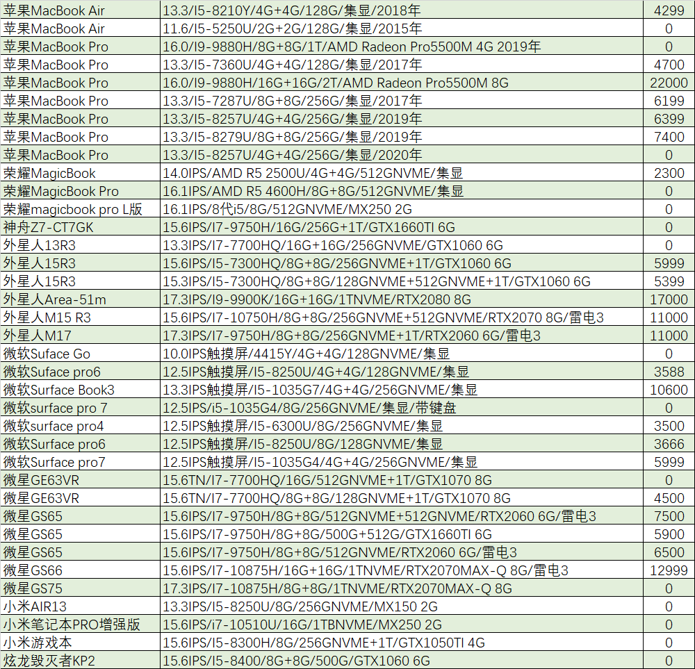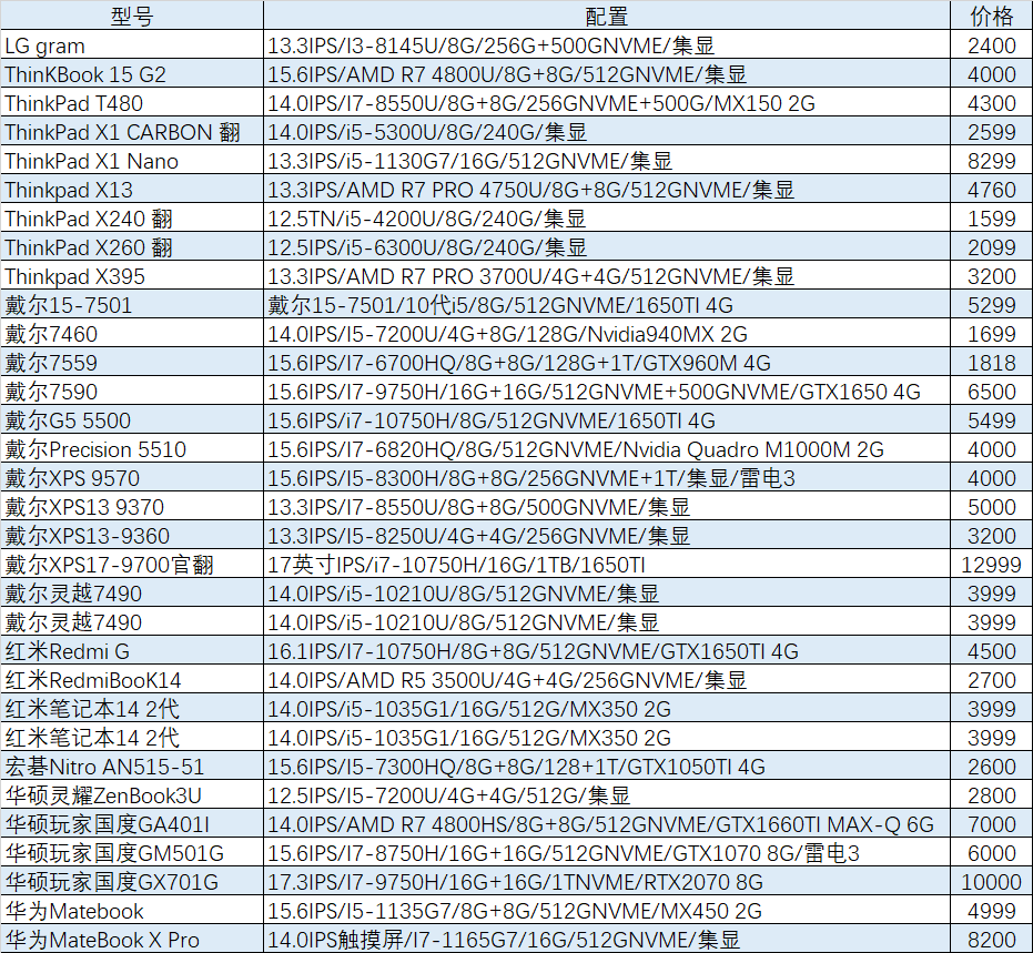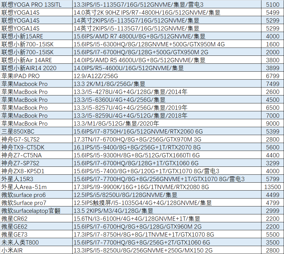 上周已售出机型:(无法列出成色,价格仅供参考)