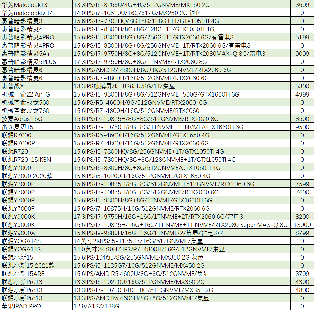 本周待售机型:(无法列出成色,价格仅供参考,0元表示卖家未定价)