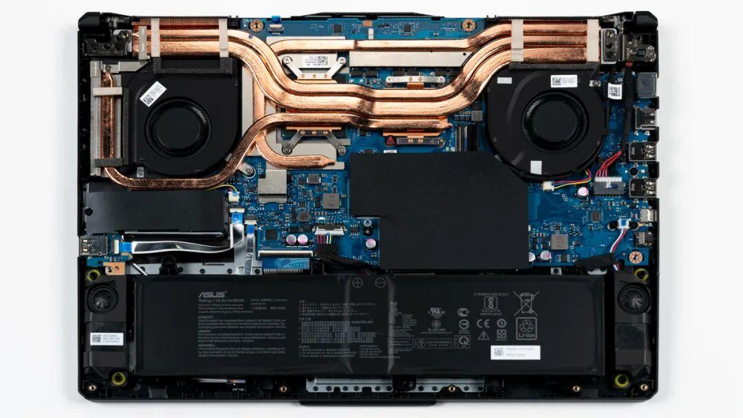 上图是华硕 天选2的拆机实拍图,四热管双风扇的组合,和RTX3070版本相比没有缩水。