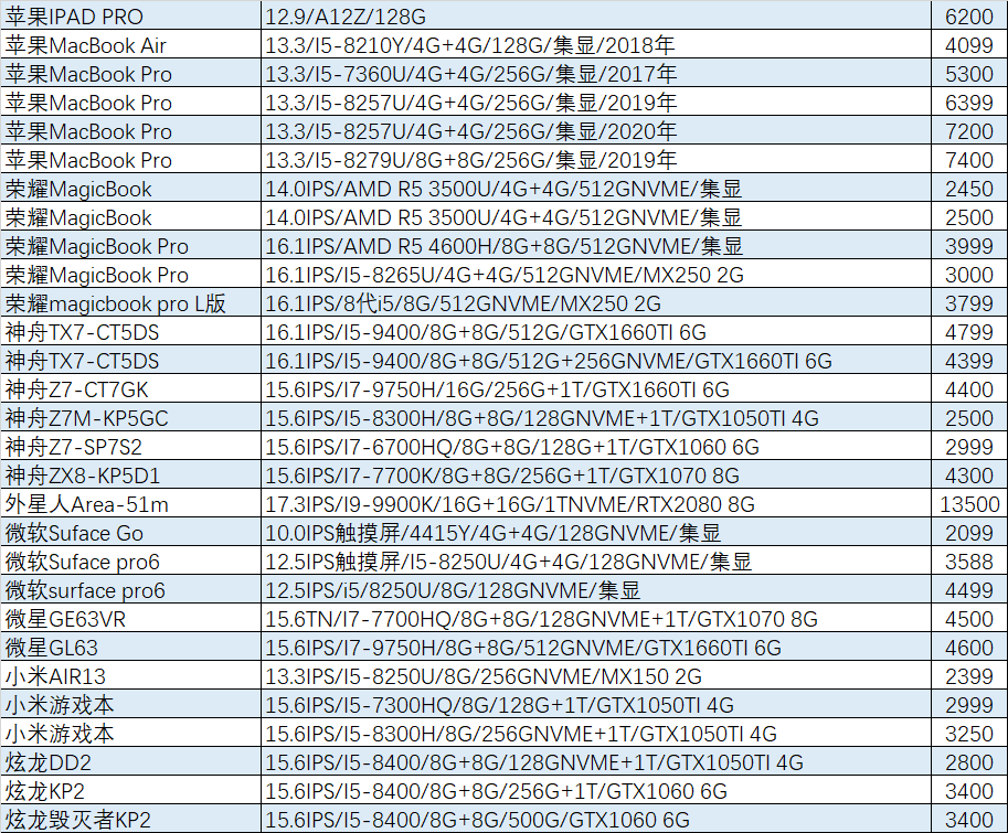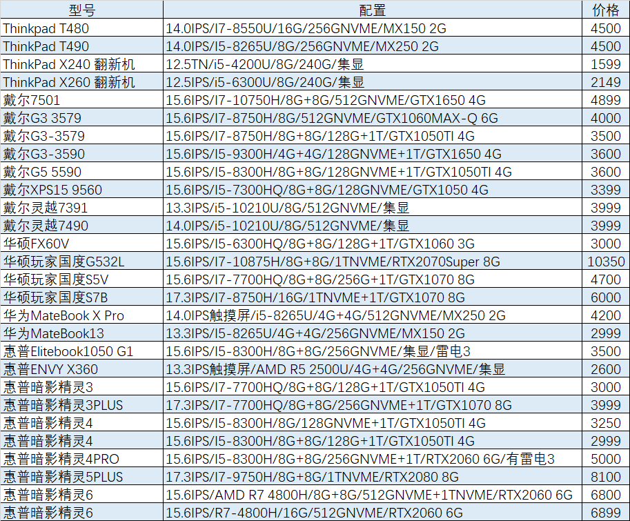上周已售出机型:(无法列出成色,价格仅供参考)