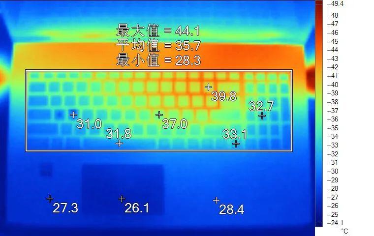 表面温度如上图所示,键盘键帽温度最高为39.8℃,WASD键位区域在31℃附近,方向键33.1℃。左腕托温度为27.3℃。