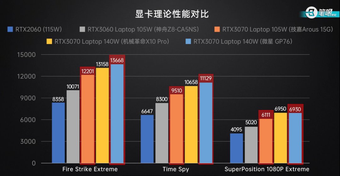上图是我们做的简单对比,同样是RTX3070,140W功耗的性能比105W强月12%~17%,在游戏中还是能感受到差异的。