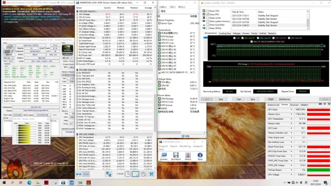 双烤的表现还是一如既往,显卡照顾很到位,CPU次之,受到95℃温度墙限制。
