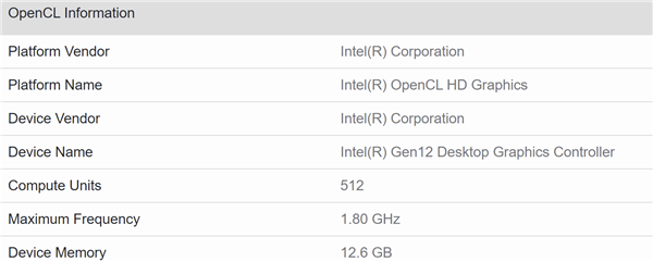 这次检测到的这张DG2显卡,拥有512个执行单元,4096个流处理器,最高频率1.8GHz,共检测到12.6GB显存(完整显存应该是16GB)