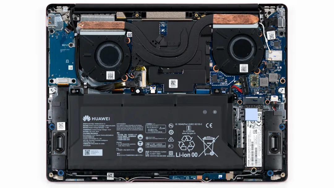 上图是华为Matebook 13 2021的拆机实拍图,双风扇双热管的组合。
