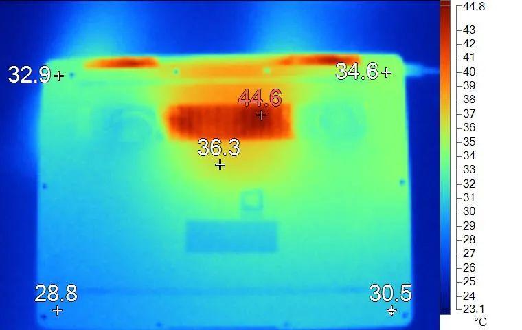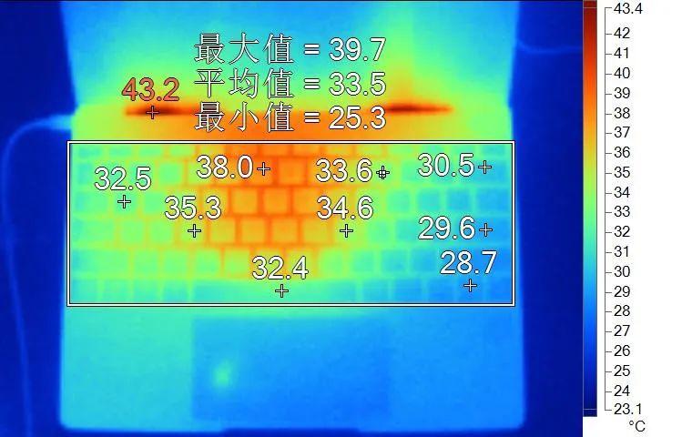 表面温度如上图所示,键盘键帽最高温38℃出现在键盘中部,WASD键32.5℃,方向键29.2℃,背面中心点36.3。