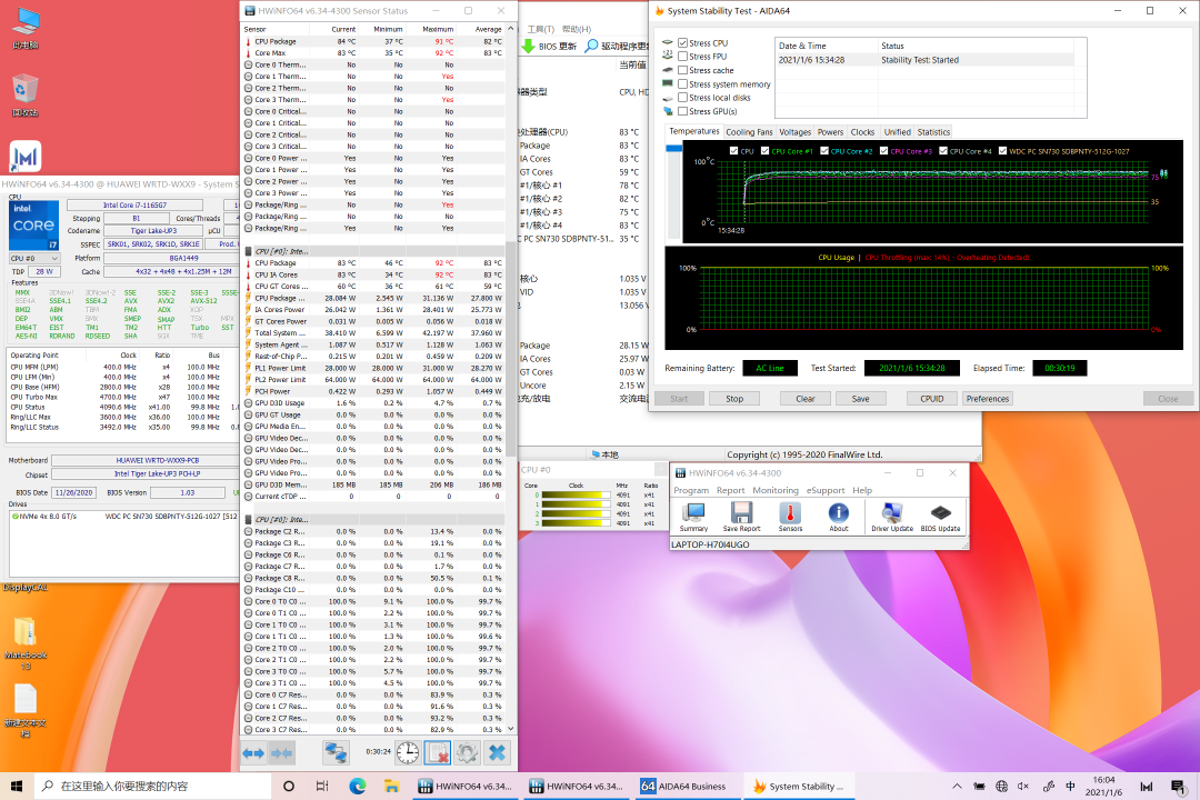 按下Fn+P开启高能模式,在满载状态下,CPU温度最高92℃,稳定在83℃,功耗28W,频率4.1GHz。