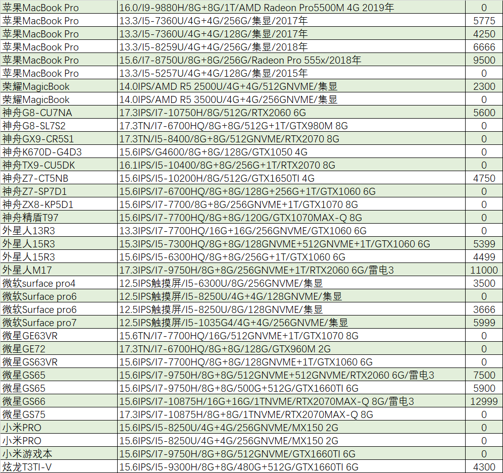 本周待售机型:(无法列出成色,价格仅供参考,0元表示卖家未定价)