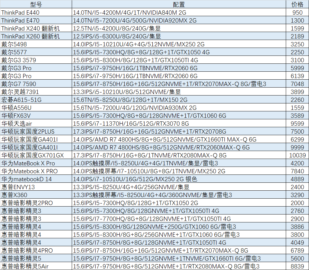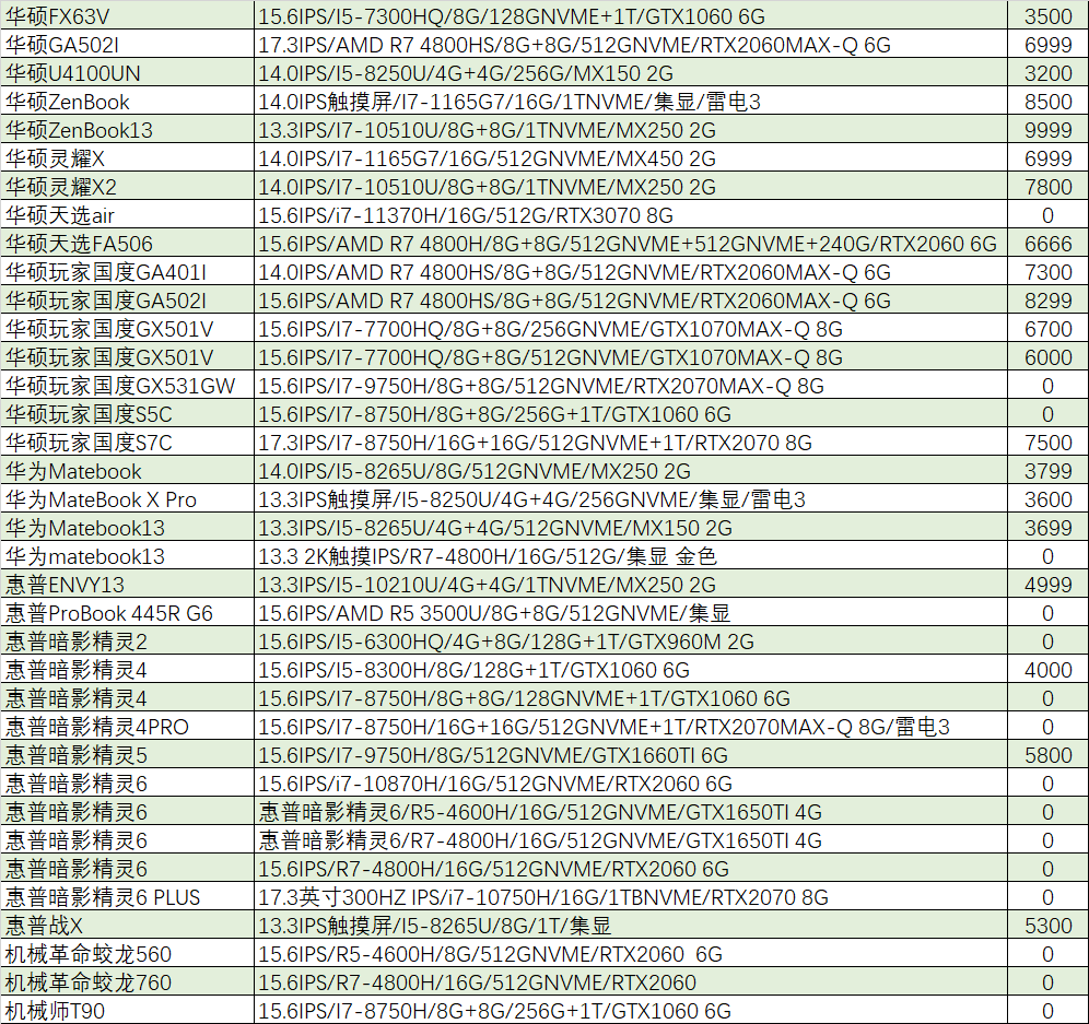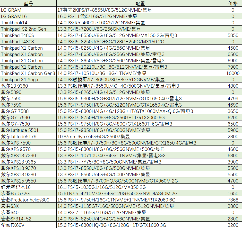 上周已售出机型:(无法列出成色,价格仅供参考)