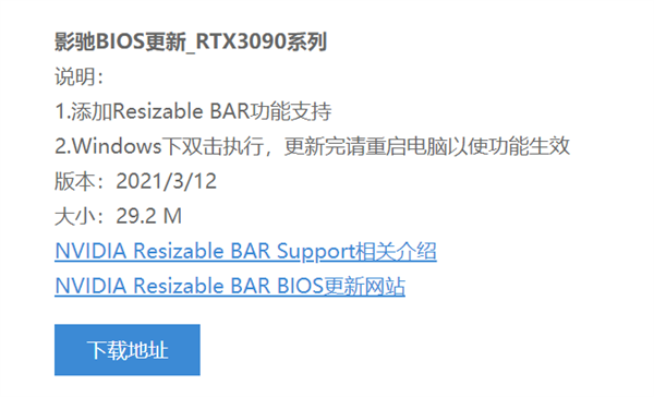 只不过眼看3月份就要过去了,可NVIDIA迟迟没有声音,就在这时,影驰率先推出新版BIOS,旗下的影驰和耕升的各款RTX 30系显卡将正式支持Resizable BAR。