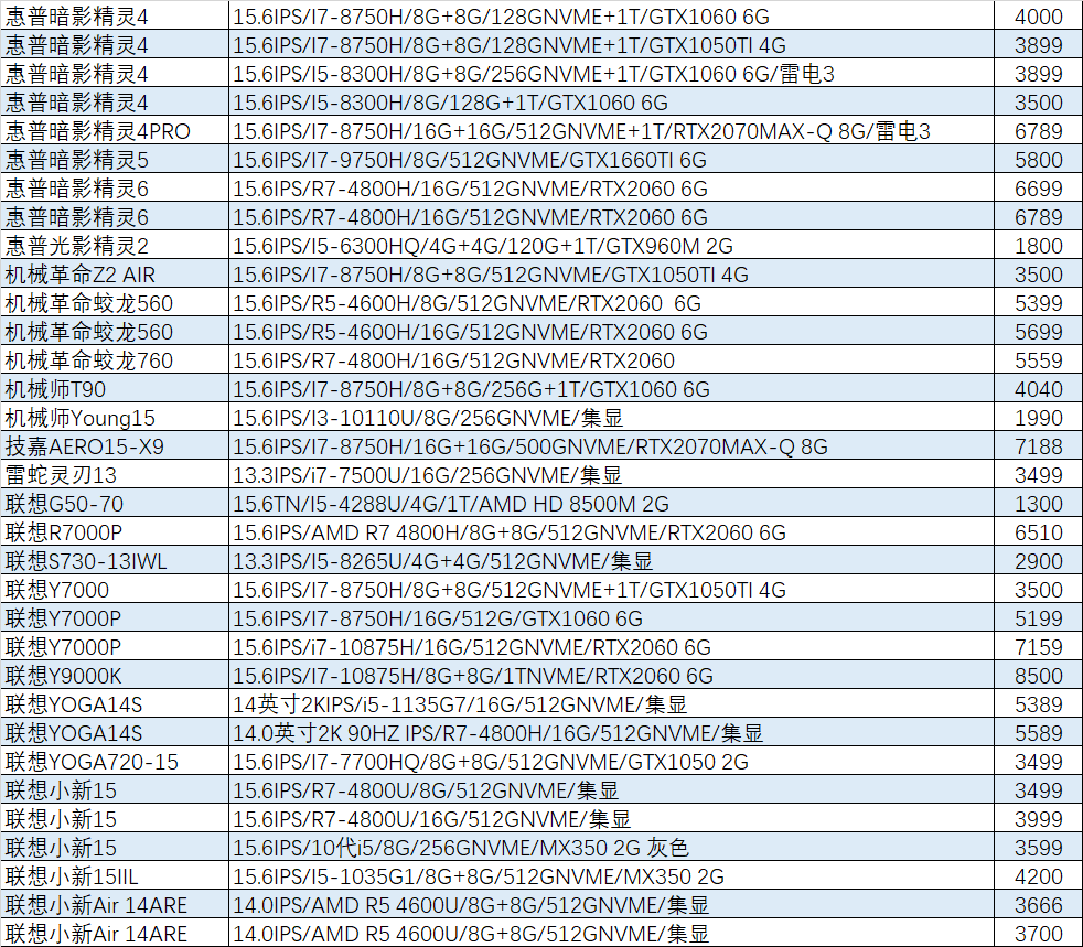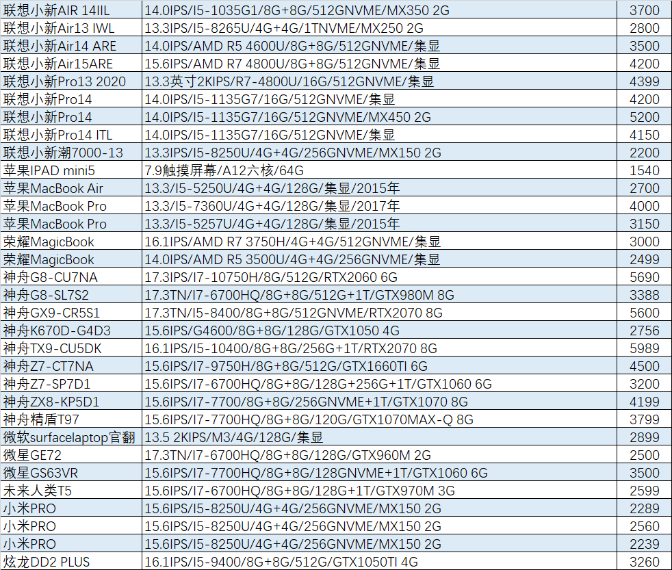 上周已售出机型:(无法列出成色,价格仅供参考)