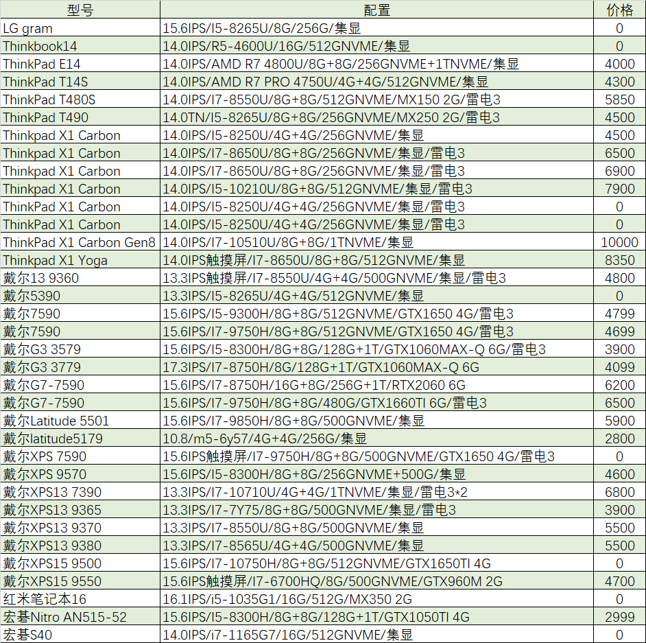 本周待售机型:(无法列出成色,价格仅供参考,0元表示卖家未定价)