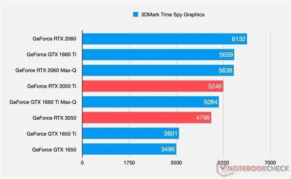 并且这次不仅参数被曝光,就连跑分和游戏性能同样也被曝光。在3DMark Time Spy测试中,RTX 3050相比于GTX 1660 Ti Max-Q低了不到6%,RTX 3050 Ti则能领先3%,同时落后RTX 2060 Max-Q 7%左右。