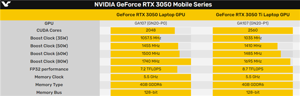 RTX 3050核心编号为GN20-P0,拥有2048个CUDA,搭载128-bit4GB GDDR6显存。频率根据功耗设定有四种,分别是1057.5MHz(35W)、1455MHz(50W)、1500MHz(60W)和1740MHz(80W)