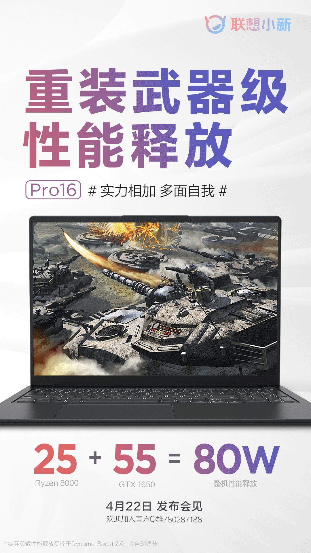 根据联想官方公布的图片可以看到,小新Pro 16将搭载AMD锐龙5000系列移动处理器,和NVIDIA的GTX 1650独显,拥有80W的性能释放,其中CPU 25W、显卡55W。