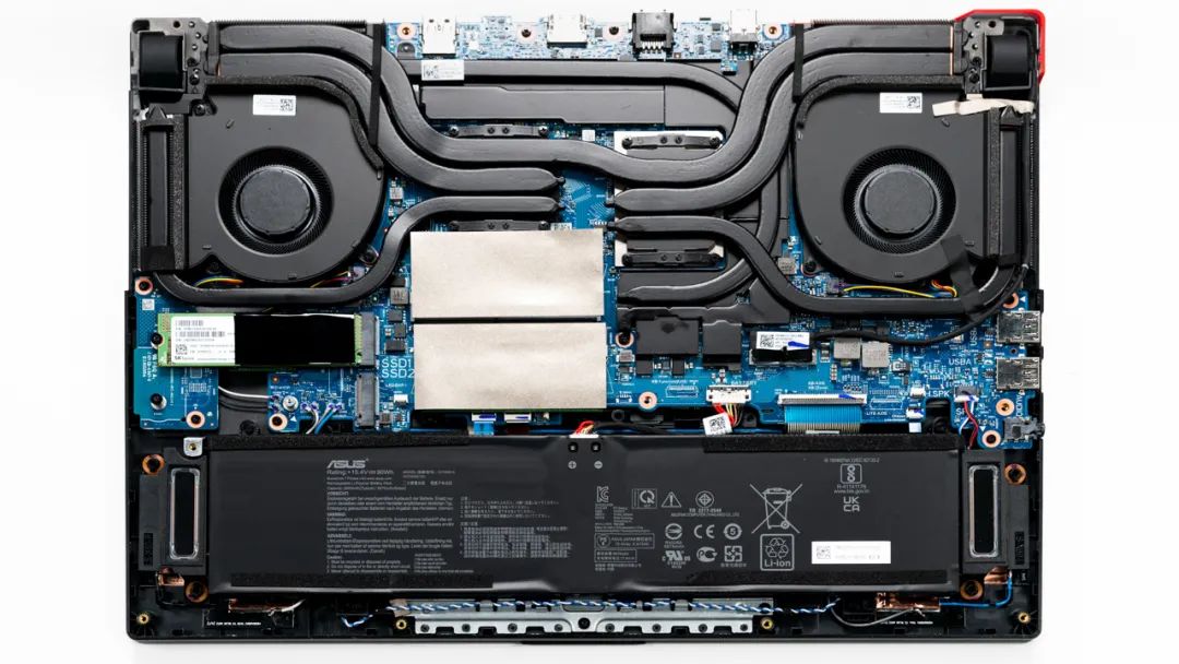 上图是ROG 魔霸新锐 2021款的拆机实拍图,6热管双风扇的组合,魔霸和枪神系列都用这一套散热。