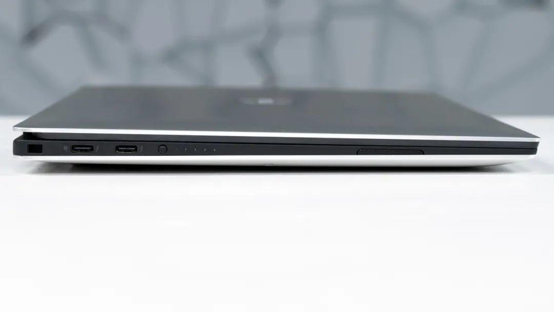 接口方面,这台电脑仅有两个雷电4接口,一个USB-C接口(3.1速率),一个TF卡槽,以及一个3.5mm音频接口。日常使用大部分情况下可能需要转接。