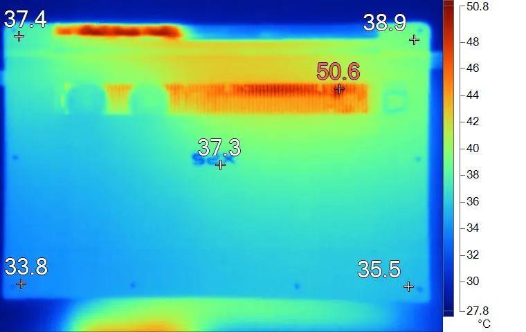表面温度如上图所示,键盘键帽最高41.3℃出现在键盘数字键区域,WASD键为39.7℃,方向键32.1℃。左腕托温度为33.8℃,背面中心点37.3℃。